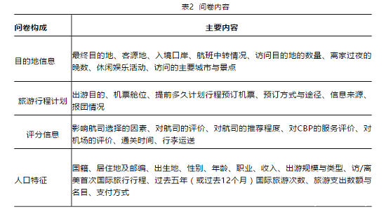 SIAT randomly surveyed non-U.S. residents visiting the United States and U.S. residents departing the United States on selected flights. The content of the questionnaire is shown in Table 2.