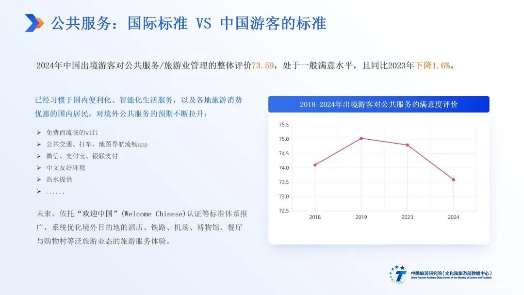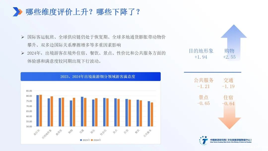 中国旅游研究院游客满意度课题组连续16年开展面向国内、入境、出境三大市场的游客满意度数据监测与研究。2024年,课题组综合线下机场拦访、线上平台调研、短信调查等多渠道数据,收集了面向27个主要出境目的地国家和地区的市场调查数据4万条,面向102个国家和地区的游客评价数据数十万条,形成《2024中国旅游者出境满意度研究报告》,核心观点如下: