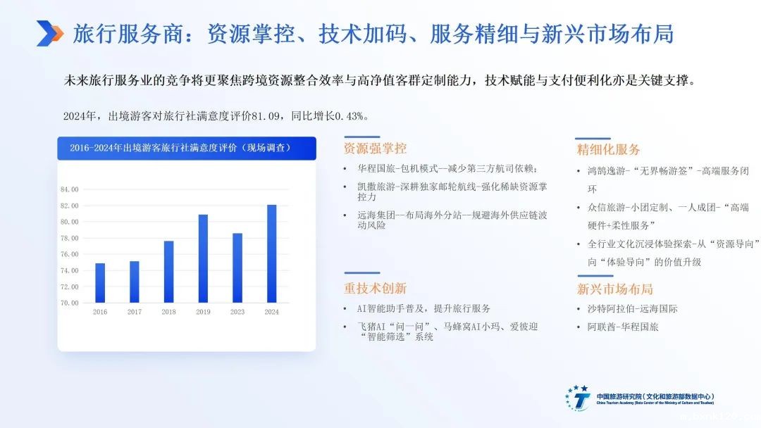 2024年,中国公民出境旅游人数 1.23亿人次,出境旅游市场稳步复苏。国内旅游市场创新加速推动国内居民的出游预期和需求标准提高,迭代需求传导至出境旅游市场,出境游客对海外目的地国家和地区的体验内容、公共服务等更为挑剔。2024年,中国出境游客满意度指数为80.06,年内出现波动,全年处于“满意”区间。