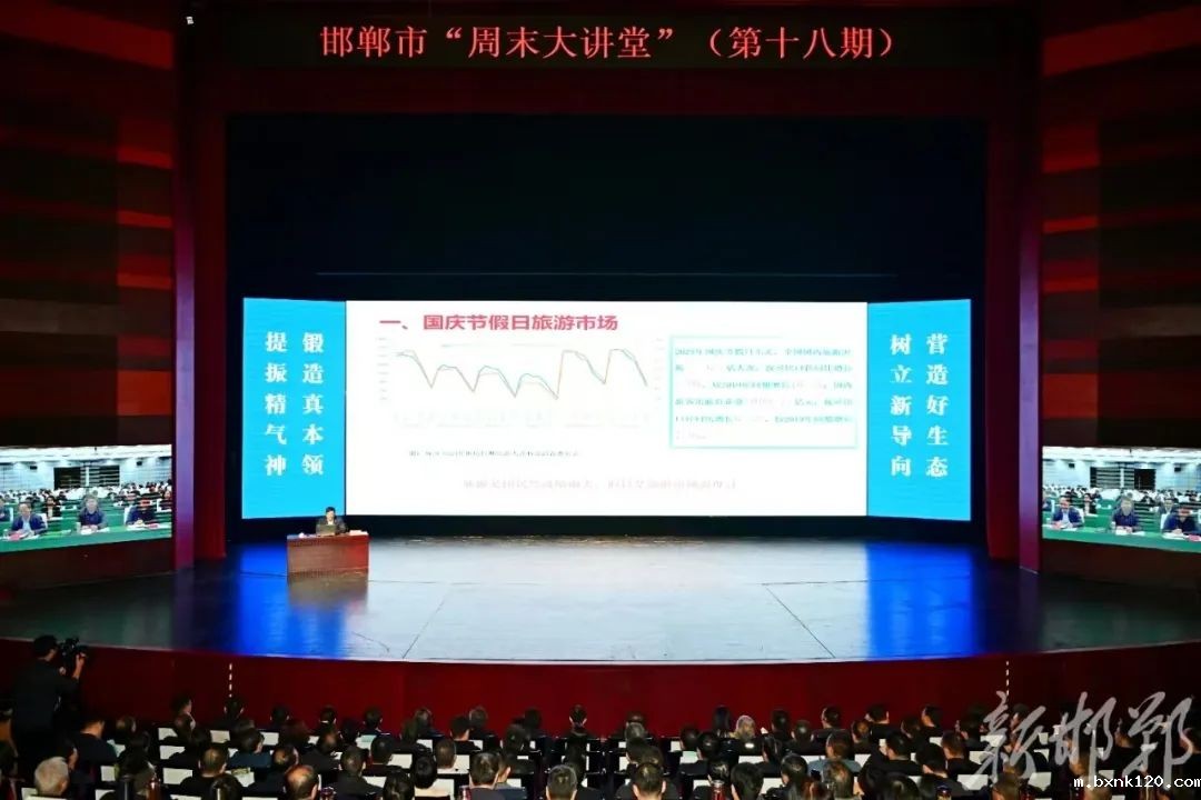 应邯郸市委市政府邀请,中国旅游研究院院长戴斌11月9日为邯郸周末大讲堂授课。戴斌以《贯彻全国旅游发展大会精神 推进旅游业高质量发展》为题,围绕国庆节假日旅游市场、前三季度旅游经济、政策展望与工作重点等方面进行了讲解。结合邯郸旅游资源和产业现状,就建设旅游强市提出了意见建议。