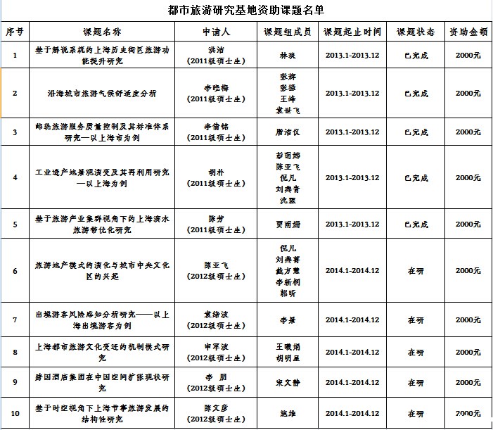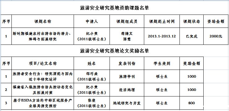 自本办法实施以来,上海师范大学(中国旅游研究院都市旅游研究基地)、华侨大学(中国旅游研究院旅游安全研究基地)、东北财经大学(中国旅游研究院基础旅游研究基地)分别于2011-2013年获得优奖计划资金各三万元。
