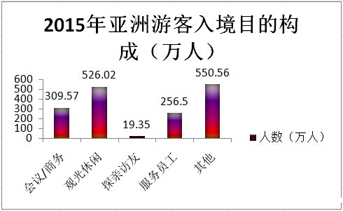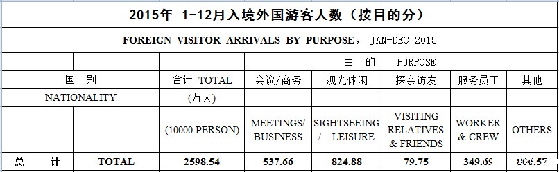Number of foreign tourists entering China from January to December 2015 (by purpose)