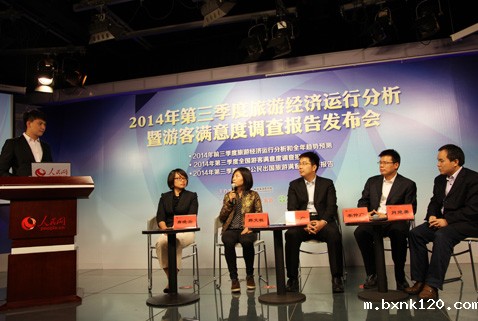 10月10日下午,由中国旅游研究院主办,人民网旅游频道、旅游卫视协办的2014年第三季度旅游经济运行分析暨游客满意度调查报告发布会在人民网演播室举行。中国旅游研究院院长戴斌教授出席发布会并做主旨演讲。中青旅质检合规部总经理李广、京东开放平台事业部生活旅行业务总监鲜文敏、中国旅游研究院产业所所长李仲广副研究员、国家旅游经济实验室负责人唐晓云副研究员等参加了发布会。来自人民日报、新华社、中央电视台、中国国际广播电台、中国日报、经济日报、中国旅游报、中国网、央视网、中国旅游网、搜狐网、凤凰网、中国经济网、蓝海电视、旅行社杂志等媒体机构的代表也参加了发布会。