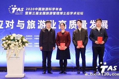 在2020中国旅游科学年会优秀论文颁奖环节,李仲广副院长宣读了一等奖、二等奖和三等奖获奖论文名单,戴斌院长为在京论文作者孙逸、耿波颁奖。