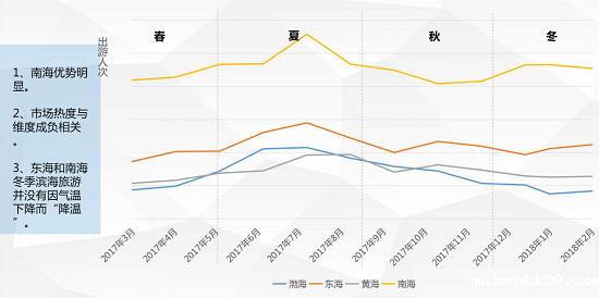 通过2017年3月到2018年2月全国9个省区、2个直辖市、53个沿海城市、242个沿海区县的客流大数据监测,我国滨海旅游市场规模为10.6亿人次,约相当于同期国内游市场的21.1%,滨海旅游者的停留时间高于乡村游、内陆自驾游、周边游、都市游等内陆出游。影响滨海旅游客源流动的因素主要包括气候、人口密度、区域经济发展水平、海岸线长度、沿海城市聚落密度、滨海旅游资源等。进一步研究表明,北方滨海旅游更加纯粹,动机相对单一,季节性更加明显;南方滨海游则表现出多样性和多元化,季节性不太明显,南海和东海的冬季滨海旅游市场并没有因气温下降而“降温”。